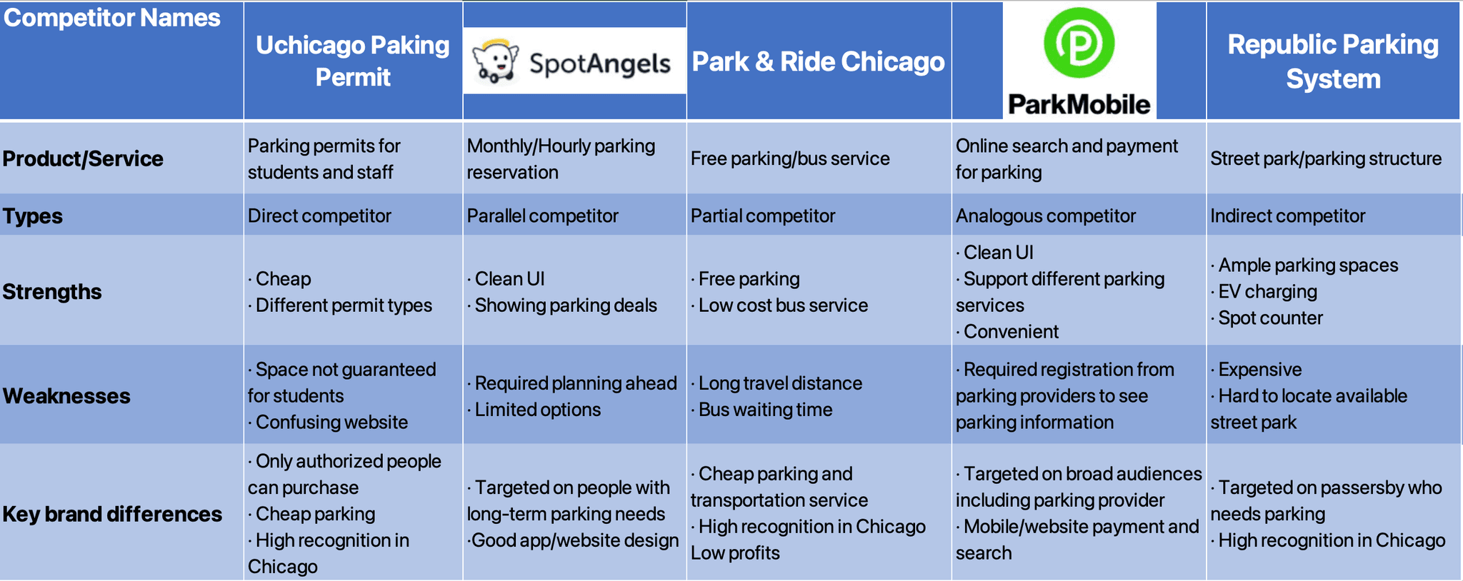 Competitive analysis was done to understand the services provided by local competitors and the current market. While these competitors cover a wide range of services related to parking, none of them seems to address the user's needs discovered in the interviews -- the need for clear parking information.
